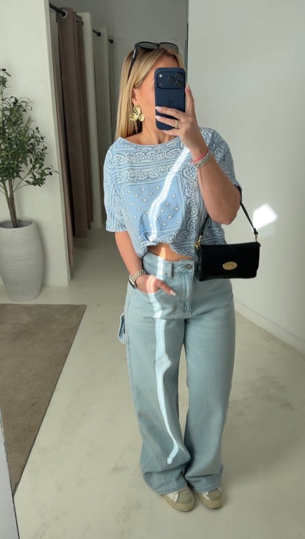 Adoptez ce t-shirt bleu à motifs bandana, une pièce tendance et facile à porter au quotidien. Sa coupe taille unique s’adapte à différentes silhouettes pour un confort optimal. Ce haut se marie parfaitement avec un jean, un pantalon ou une jupe pour un look casual et stylé. Idéal sous un gilet ou porté seul, il apporte une touche moderne et originale à votre dressing.