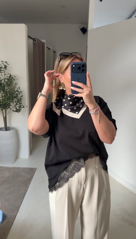 Craquez pour ce t-shirt noir revisité avec une finition en dentelle asymétrique sur le bas, pour une allure moderne et féminine. Facile à associer, il se porte aussi bien avec un jean, un pantalon ou une jupe pour un look casual chic. Ce haut élégant apporte une touche de sophistication tout en restant confortable, idéal à glisser sous un gilet ou à porter seul pour sublimer votre silhouette.