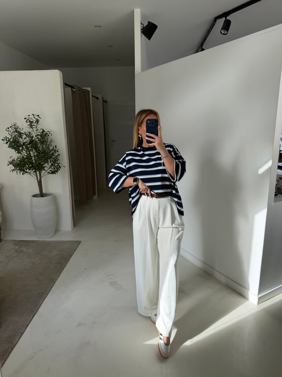Cette marinière à manches courtes est un incontournable du dressing, revisitée avec un joli détail qui fait toute la différence : un nœud délicat dans le dos. À la fois chic et décontracté, ce t-shirt marinière apporte une note originale à une pièce basique.