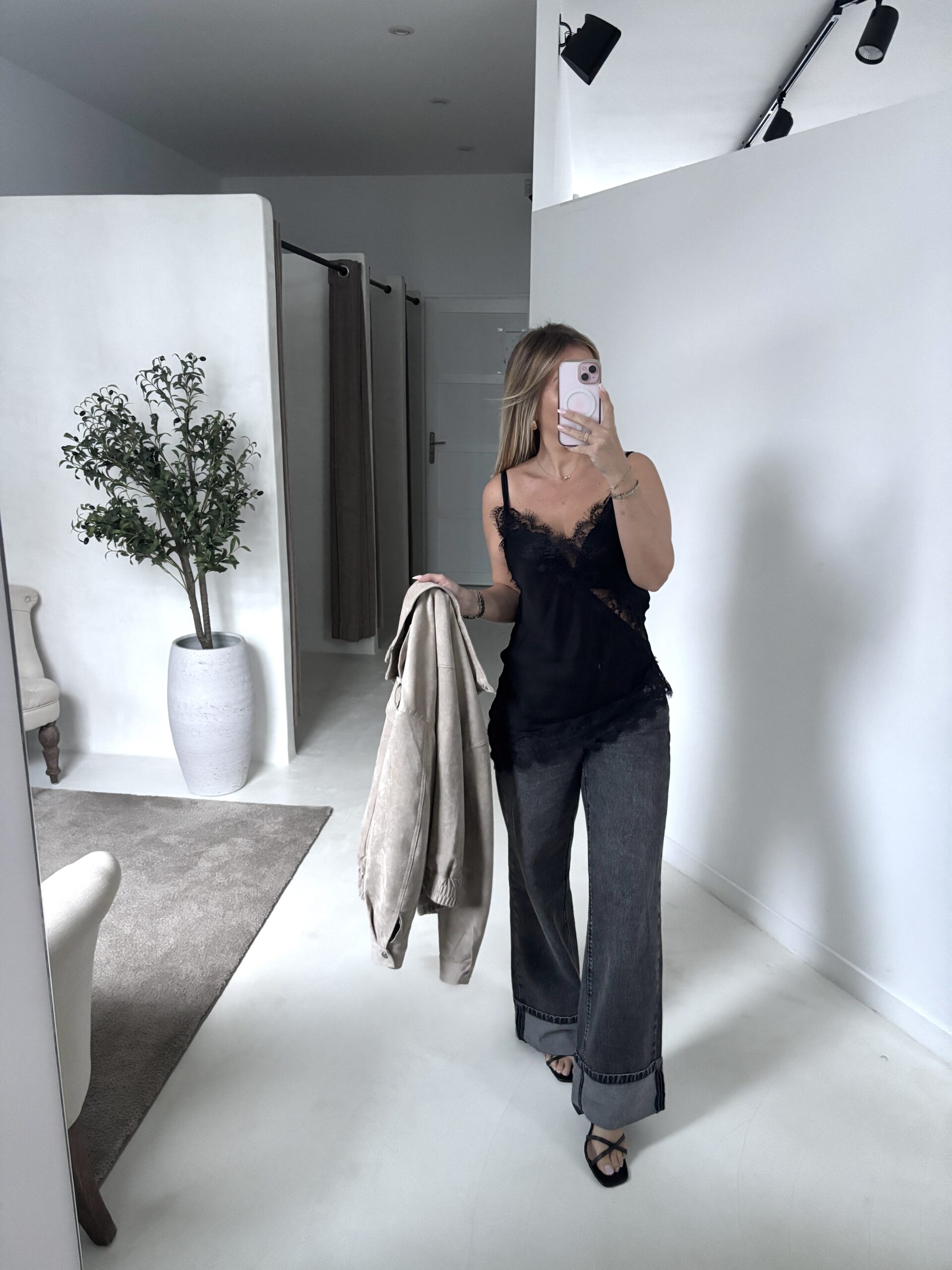 Féminin et raffiné, ce top à bretelles séduit par sa dentelle délicate et sa coupe asymétrique originale. Idéal pour un look chic et estival, il se porte avec un jean, un pantalon fluide ou une jupe légère