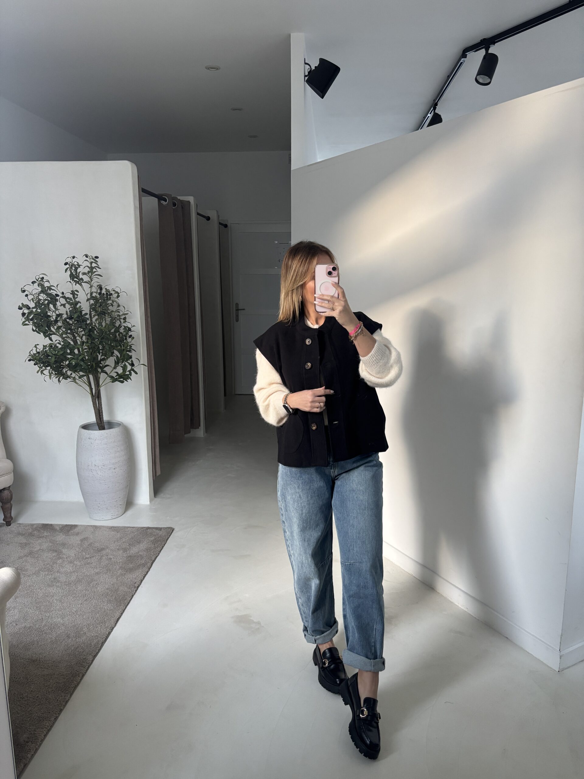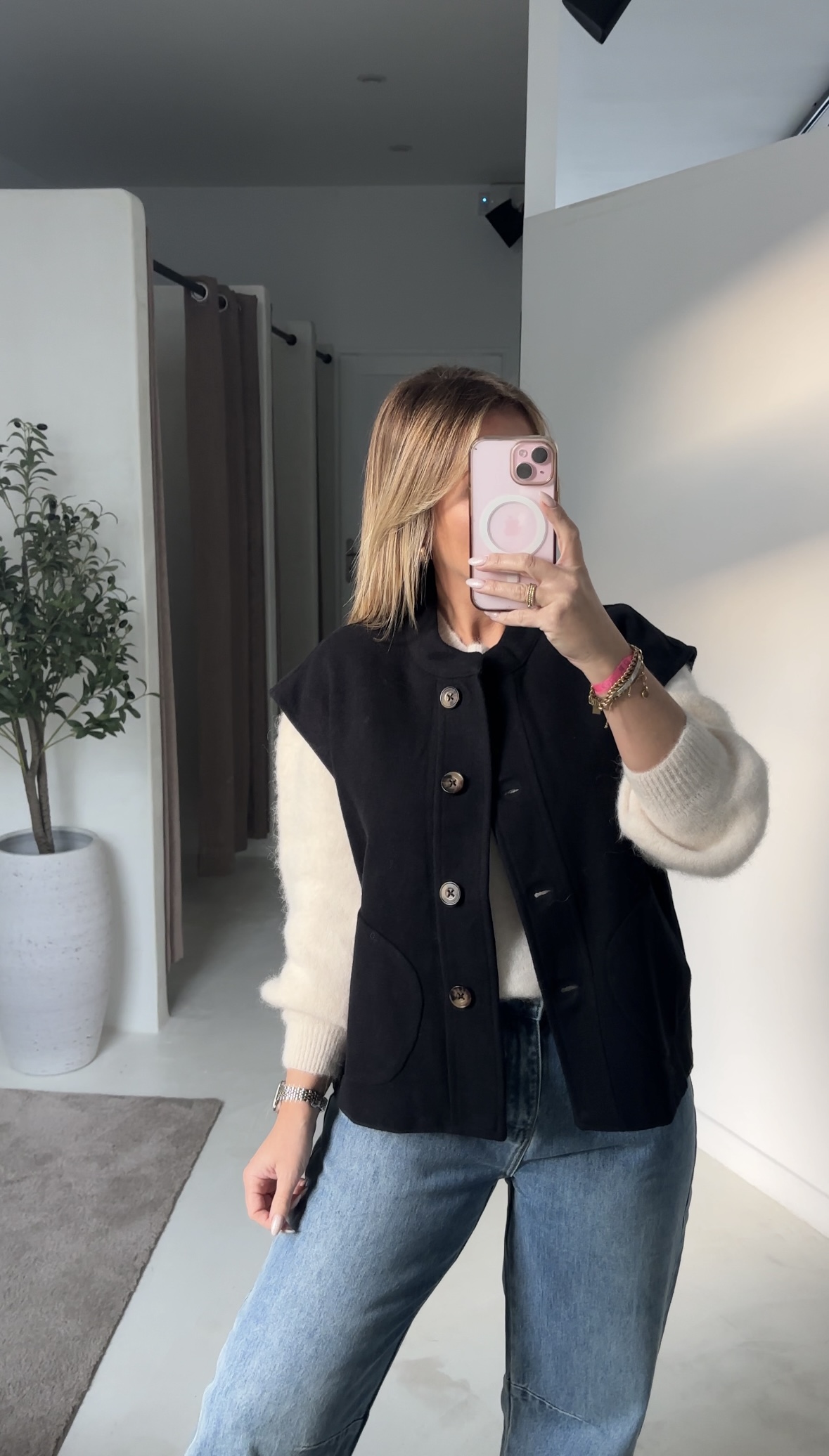 Veste sans manches noir au style casual chic, parfaite pour compléter toutes tes tenues ! On adore ses boutons sur le devant et ses poches pratiques qui apportent une touche tendance et décontractée. À porter sur un pull, un gilet fin ou un t-shirt pour un look automnal ultra stylé.